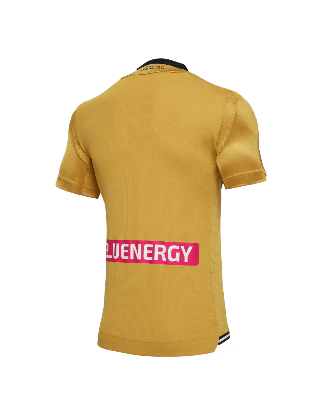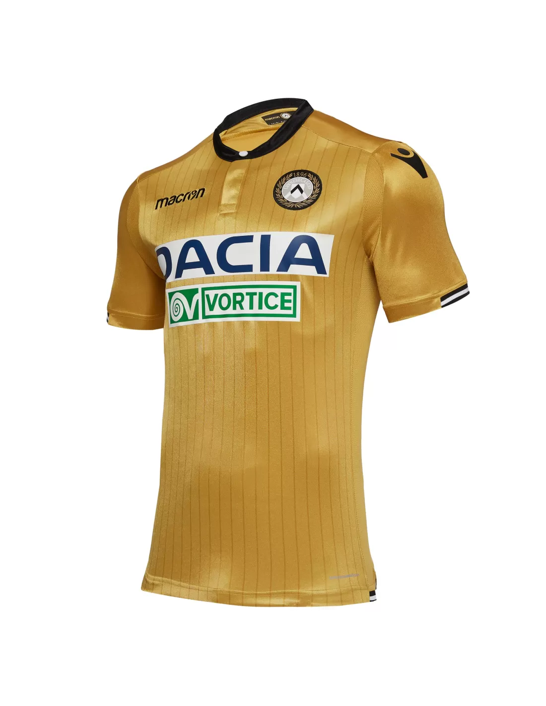 La maglia gara away dell'Udinese si presenta in un audace color oro ed è impreziosita da inserti in costina di colore bianco sia a fondo manica che a fondo maglia. Il capo è arricchito da alcuni dettagli che omaggiano la tradizione e la storia del club: il backneck personalizzato con l'aggiunta della frase 'I primi bianconeri d'Italia' e il retro del colletto in corrispondenza del quale è stata invece ricamata un'altra celebre frase ovvero 'La passione è la nostra forza'. Completano l'insieme il raffinato scollo alla coreana e gli inserti in mesh e in micromesh che favoriscono la traspirazione garantendo comfort e freschezza anche nelle situazioni di gioco più impegnative.